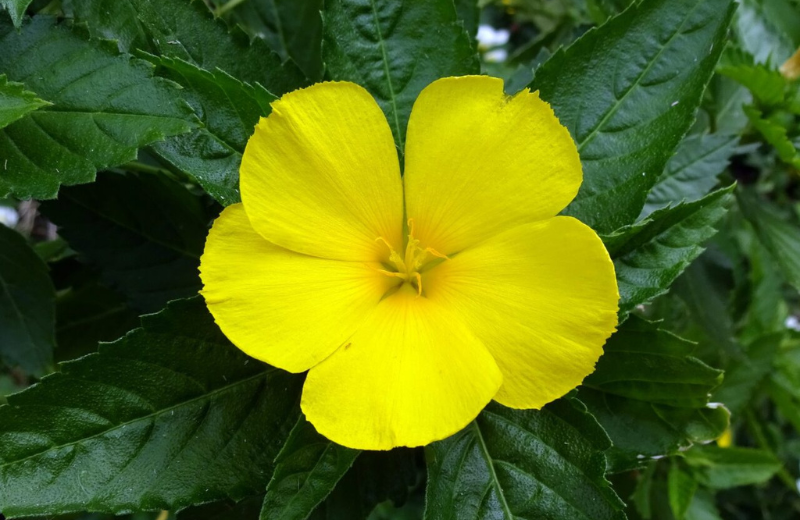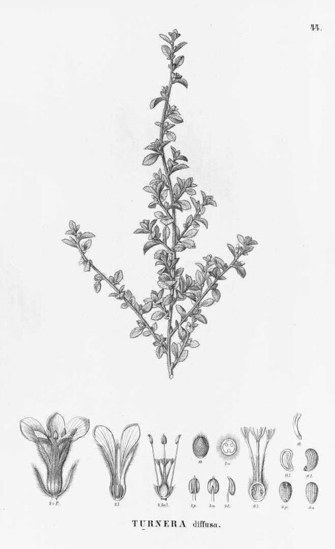 Botanical Description: Damiana is a small shrub with pale green, serrated, wedge-shaped leaves arranged alternately on a short, slender leafstalk. The small, 5-petaled yellow flowers grow in the leaf axils, and produce a small fruit whose taste is said to be reminiscent of fig.